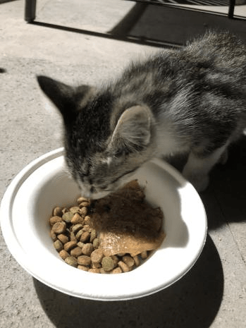 She’s thin and the babies are thin. As I was left without adult supervision, I went and got some food for them. The kittens were afraid of me until they smelled the food and began devouring what was set before them. Mama cat, bless her, held back and let her babies eat first. I put out a little pillow in a box on the back porch for them to sleep in. The first night, I think, went well. But, we have a lot of dogs that roam the neighborhood at night. I woke up to barking. I chased off the dogs that were in our yard. Mama moved the babies before morning. She had moved them to a small portion of our yard that is fenced (it has utility boxes, etc.).